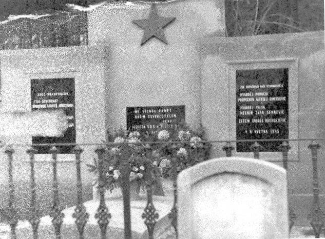 Původně byli pohřbeni v polích u osady Křižatky. 1.5.1951 převezeni do hrobky na hřbitově.
