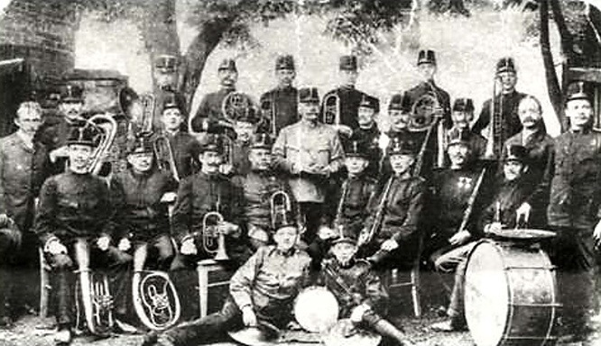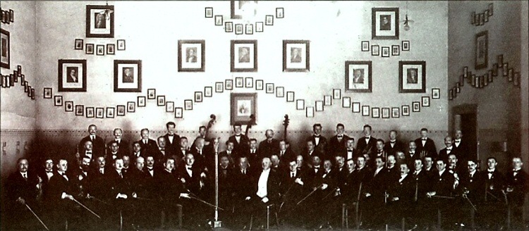 S náprsenkou kapelník Gehrschon, který byl z Chomutova. Třetí vlevo Ulmar Liebscher u 1. houslí.Hudebníci pocházeli z celého Litvínovska